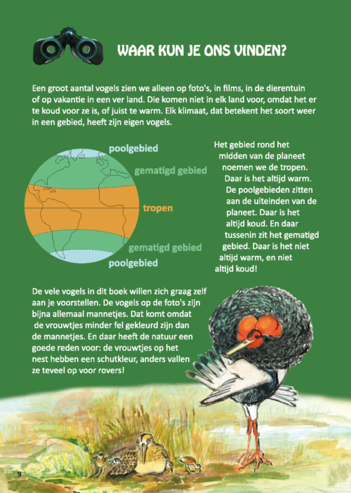 ‘Dit is geen gewone vogelgids, maar een boek met een verhaallijn van vogels over de hele wereld, samen met talloze vogelfoto’s en illustraties. Ook vogels die kinderen normaal gesproken nooit zien maar alleen horen, haalt dit boek dichterbij, vandaar het kind met de verrekijker op de cover’.
